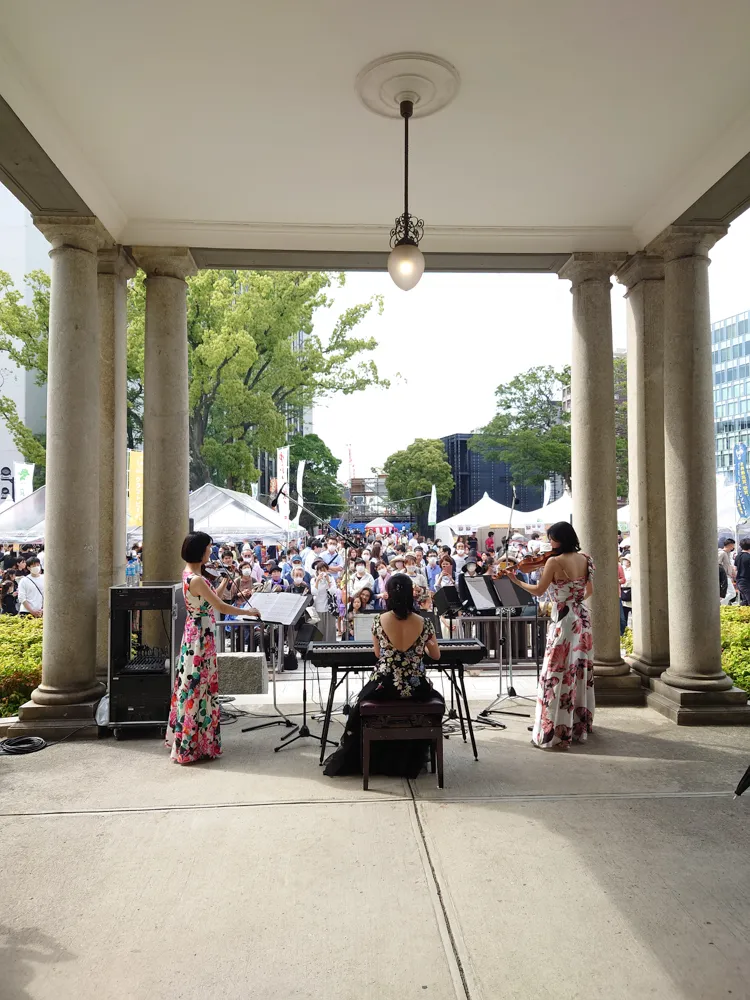 貴賓館エントランスにて行うミュージアムコンサートやお花のフォトブース、明治時代の貴賓館や西中洲の歴史パネル展、貴賓館ボランティアガイドによる館内ガイドツアーなど実施。 2日間とも天気にも恵まれたことから、多くの方にご来館いただきました。お花のフォトブースではご家族と記念撮影をされる方も多く、みなさまの笑顔に元気をいただきました。