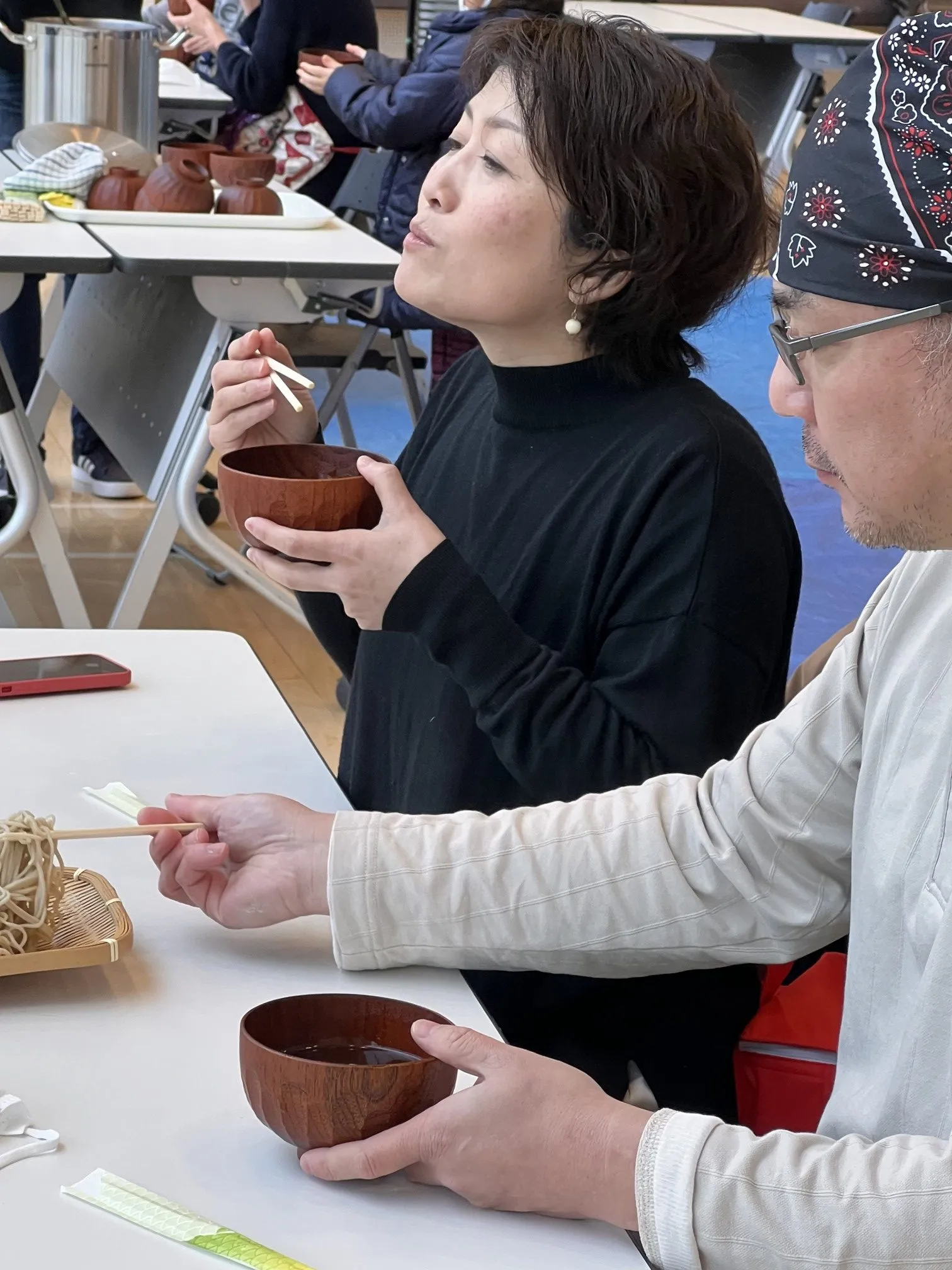 蕎麦の打ち方の手ほどきを習いながら、最初から最後まで真剣に自分の蕎麦を打っている姿を見ていると、美味しい蕎麦作りにハマってしまいそうでした。生憎冷たい小雨の降る中で同好会様がこだわりの蕎麦の茹で加減に氷水できりりとしめた蕎麦を試食用にご用意下さり、参加された皆さまは最後に美味しい蕎麦に舌鼓を打っておりました。自分で打った蕎麦はお土産となり、三郷そば打ち同好会様との交流も深められて楽しいイベントとなりました。