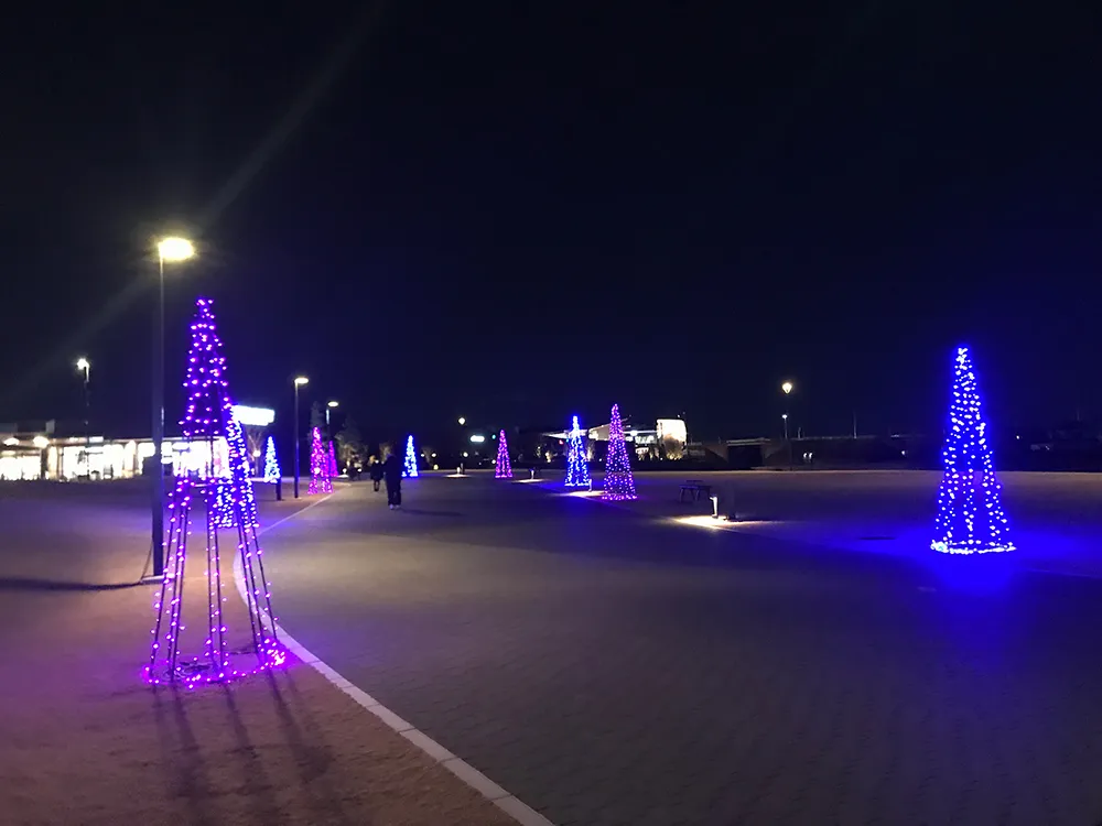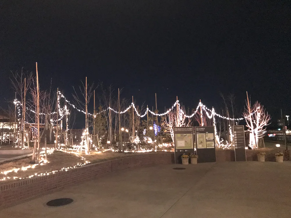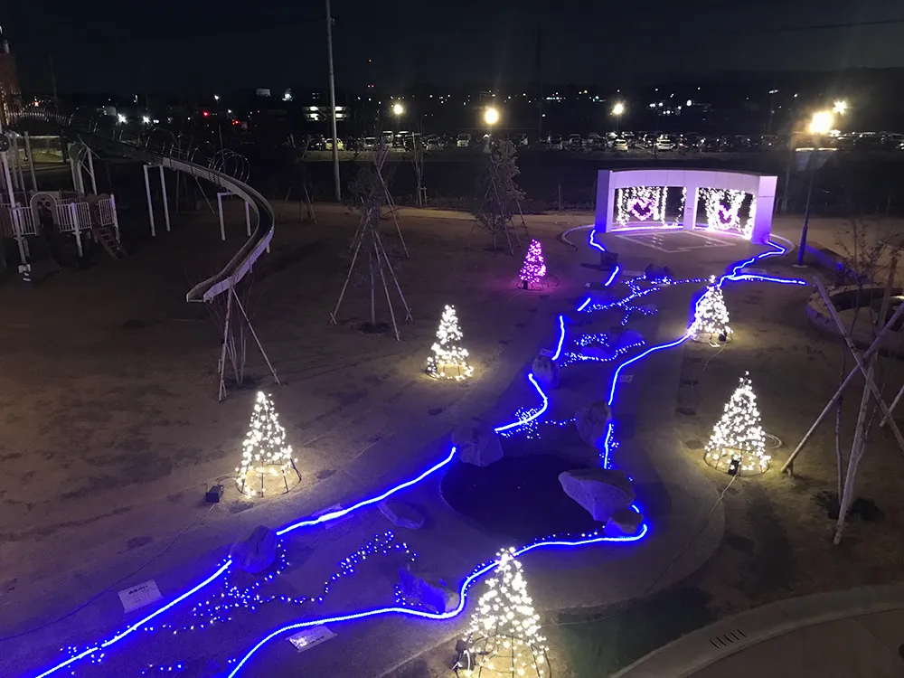 深谷テラスパークは地域のみなさんに楽しんでい頂く場所、隣接するアウトレットに来たお客様に深谷市の魅力を配信する場所として本年度5月にオープンした1年目の施設です。 今年の冬は「ふかや市商工会青年部」と連携した取り組みとして深谷テラスイルミネーションを実施しています。
