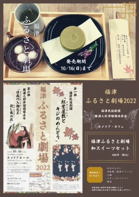 福津で毎年開催の『福津ふるさと劇場2022』を応援するため、カメリア・カフェでコラボメニューを企画しました。福津ふるさと劇場は、「福津民話劇団」と「勝浦人形浄瑠璃保存会」で構成され今年18年目となります。