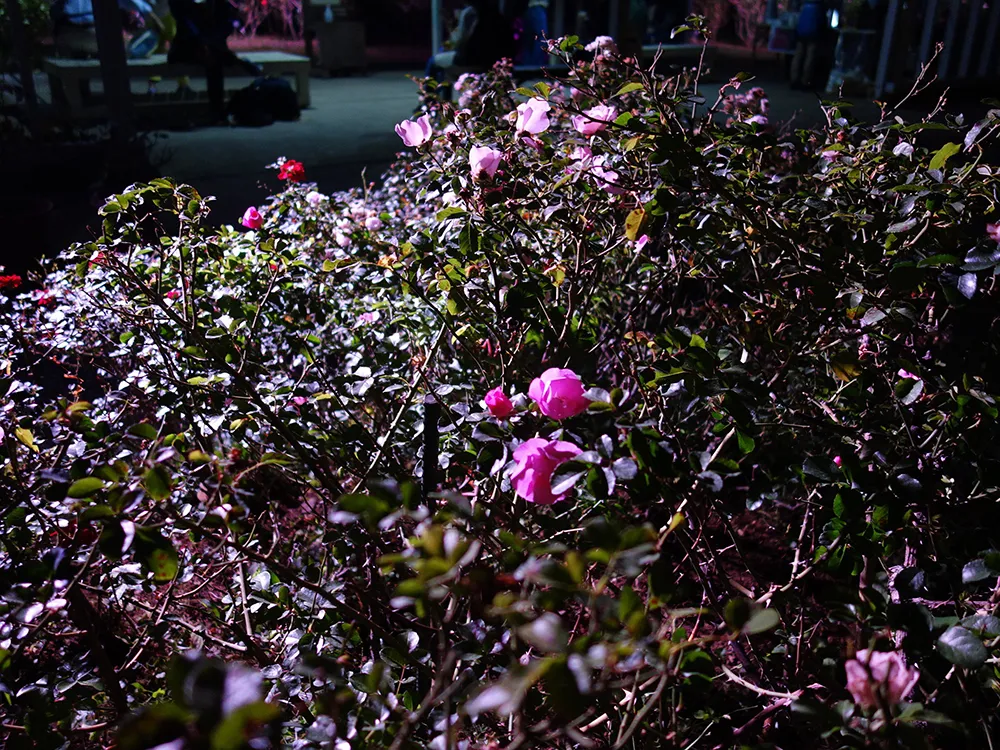 大船フラワーセンターバラ園の秋バラをライト アップ!今年は夏の天候の影響で例年より開花が遅 れていましたが10月後半からは気候も良くなり開花 が進みました。夜間開園の秋バラのLight upでは多く の来園者の方々に夜のバラを楽しんで頂きました。
