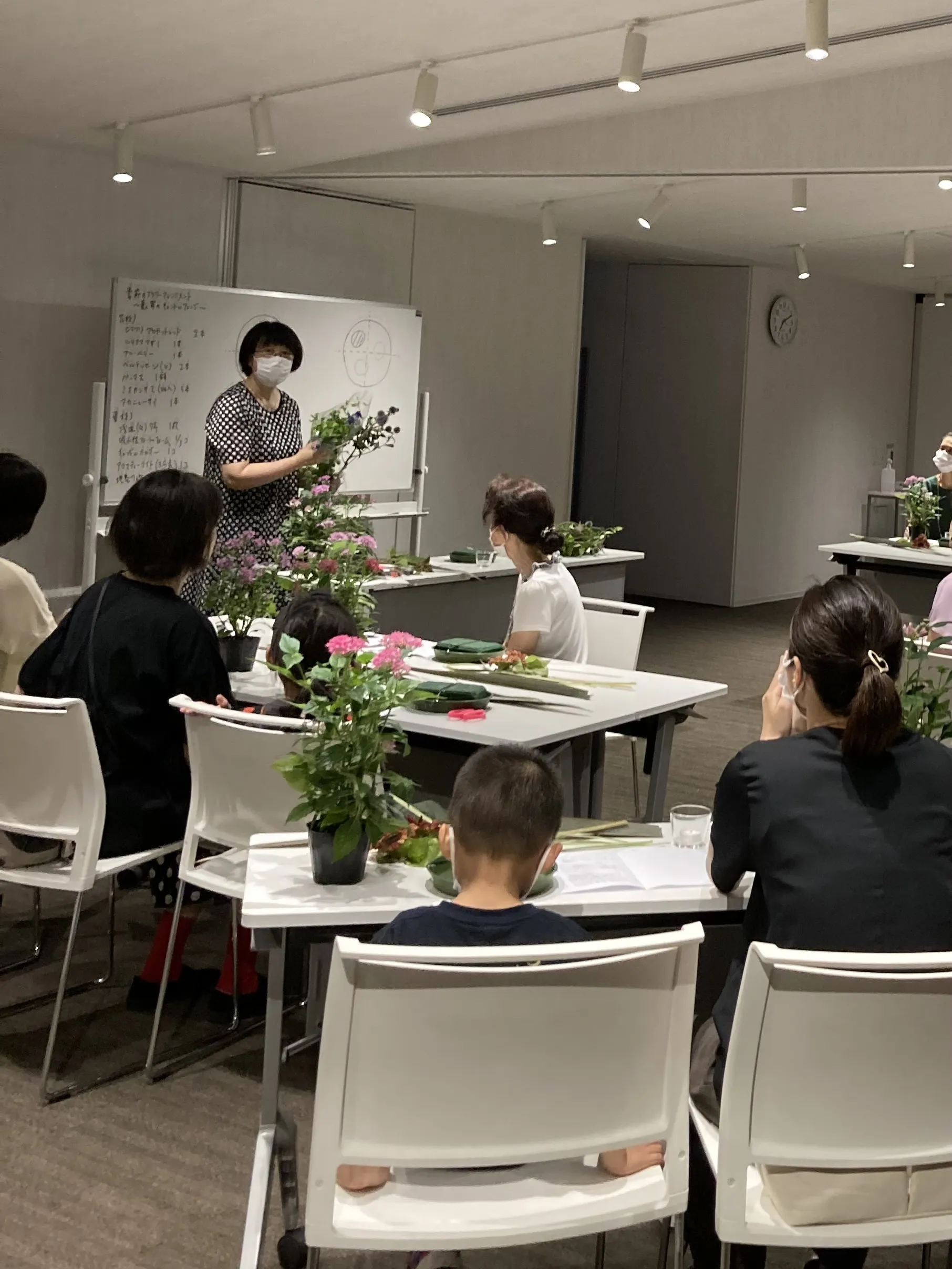 それぞれ個別にアドバイスを受けて、思い思いのアレンジメントが完成しました。会社帰りの方や夏休み中の親子での参加もあり、せせらぎ館の夜の落ち着いた雰囲気の中で、いつもとは違った有意義な時間でしたとのお声をいただきました。