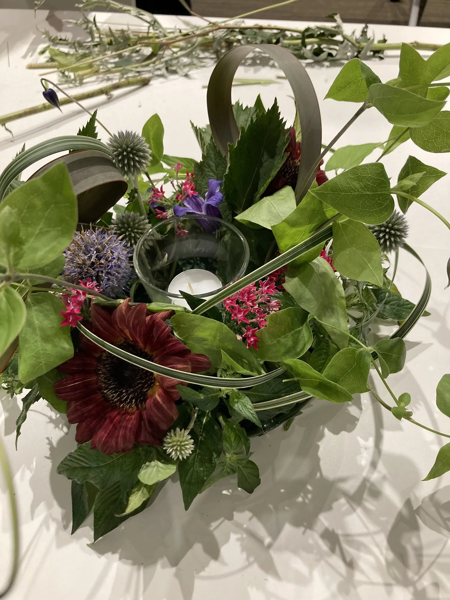 好評のフラワーアレンジメントを大人向けに夜に開催しました。夏の宵のひとときよ時間を豊かに過ごすキャンドルアレンジ。先生から花材の使い方やデザインの説明があり、その後自由にアレンジ。