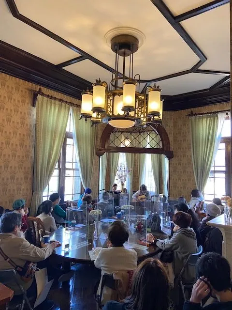 福岡で活躍するアーティスト「キネマチコル」によるアコーディオンとギターのクリスマスコンサートを開催しました。カフェ内で行なう1日3公演のミニコンサートでは、映画音楽からジブリなどのアニメ音楽と、お子さまからご年配の方まで幅広い年齢層の方に楽しんでいただけるコンサートとなりました。
