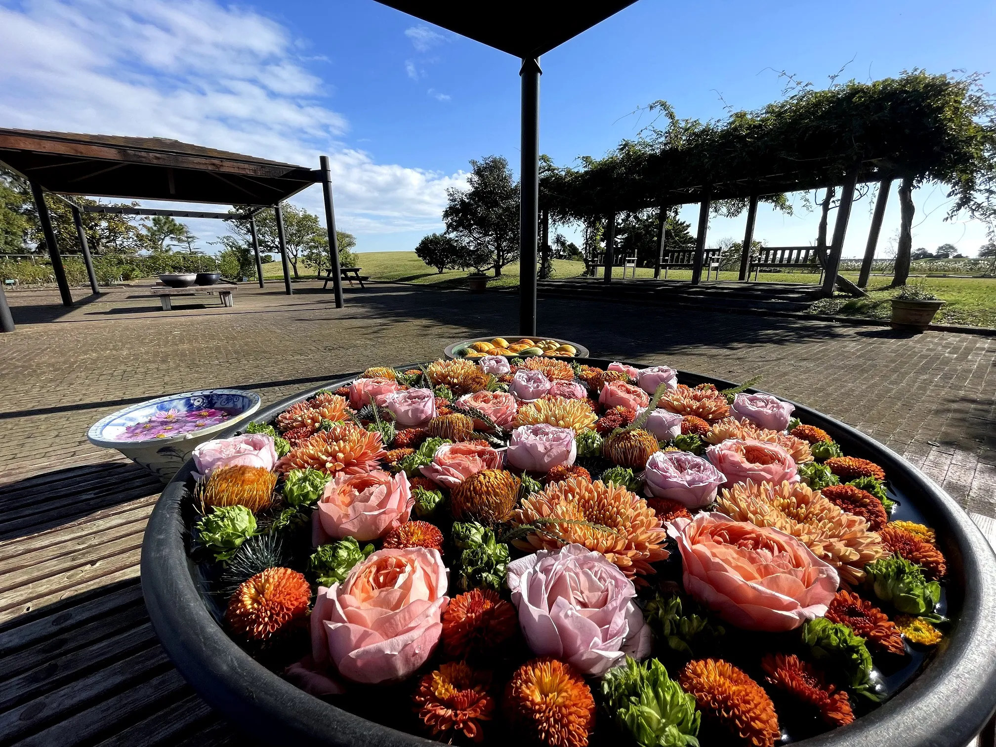 せんだい農業園芸センターの花のある風景をよりお楽しみいただけるよう、「花手水」風の浮き花展示を行いました。コスモスの見頃に合わせ、秋らしさを感じる花や実等を丁寧に浮かべました。
