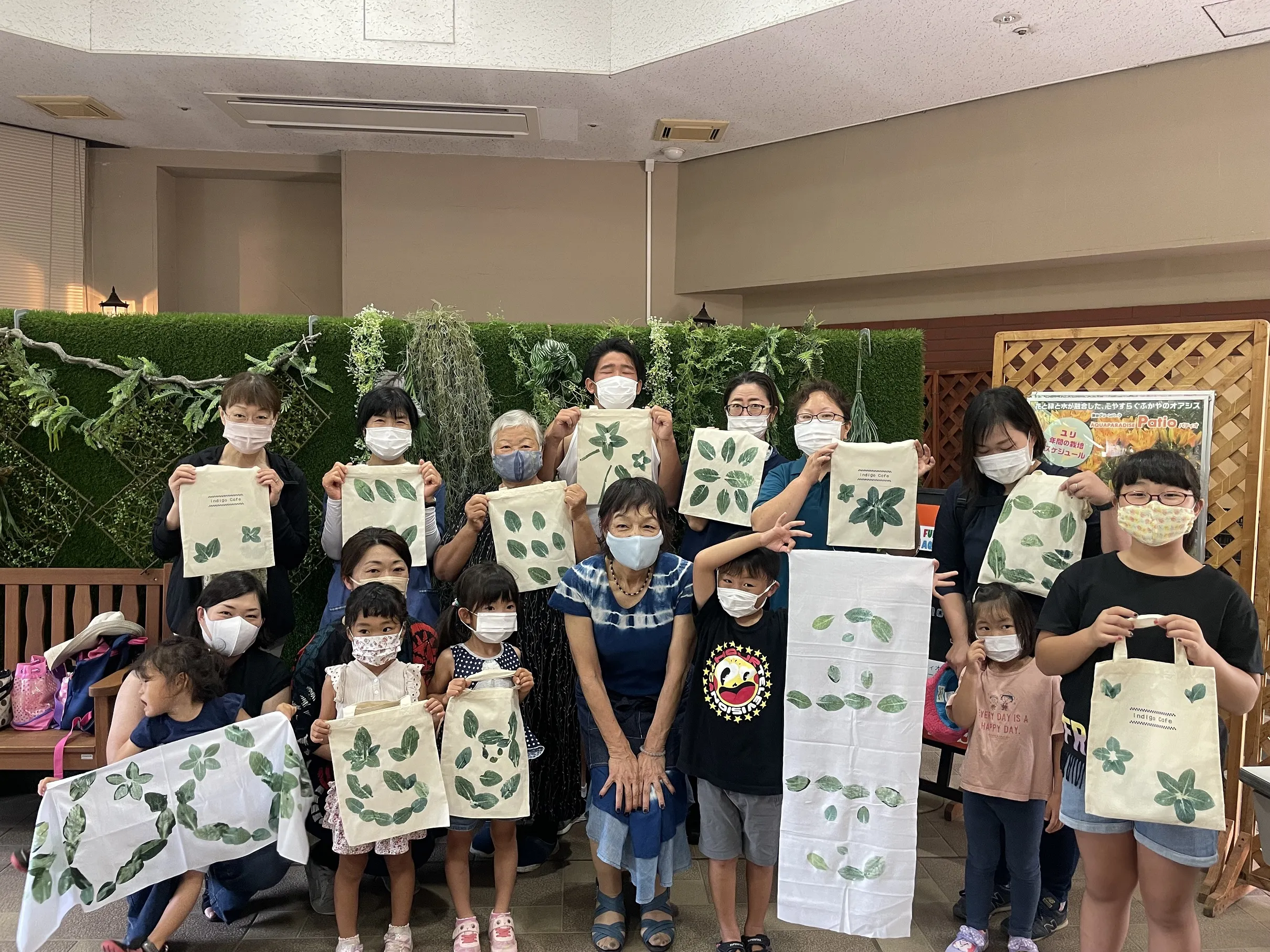 市内の「藍染カフェ」から講師2名を招き、葉の収穫から染色方法の説明などわかりやすくレクチャーを受けました。ハンカチ・トートバック・てぬぐいの3種類から生地を選び、葉を並べ、上から擦るという工程で、少し力がいる作業でしたが、小さなお子様は親子で協力して、とても可愛らしいデザインの作品を仕上げることが出来ていました。