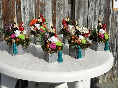 今回のフラワーアレンジメント教室は「初春(はつはる)の慶び~雅やかなお正月アレンジ~」と題し、お正月の門松をイメージしました。3本竹を立てたら中心部にプリザーブドフラワーを配置し、周囲には手毬風の球、扇などで華やかに飾りました。