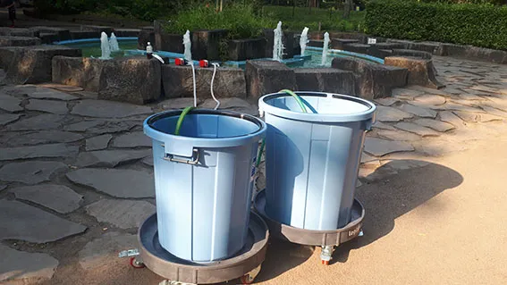 地域の利用者を対象とした夏の暑さを和らげる打ち水イベントを開催しました。打ち水の用水は公園のエコ活動として、木曜日の噴水清掃にあわせ前日の水曜日の夕方から公園の噴水の水を大型の樽に汲み上げ使用しました。