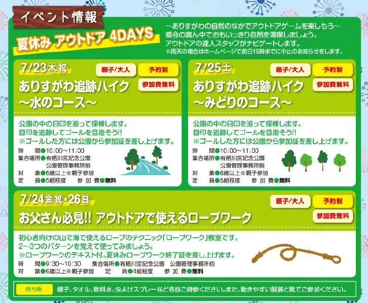 ②アウトドアで使えるロープワーク講座(お父様とお子さまを主なターゲットとした初心者向けクラス) の2つを実施します。