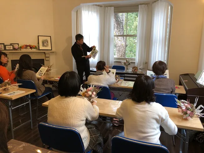 今回はお手持ちのスマートフォンを使って学ぶ、フォト講座とのコラボレッスンでした。制作したブーケをより素敵に映えるコツを学びました。皆さん自分で作ったブーケを真剣に撮影されてました。