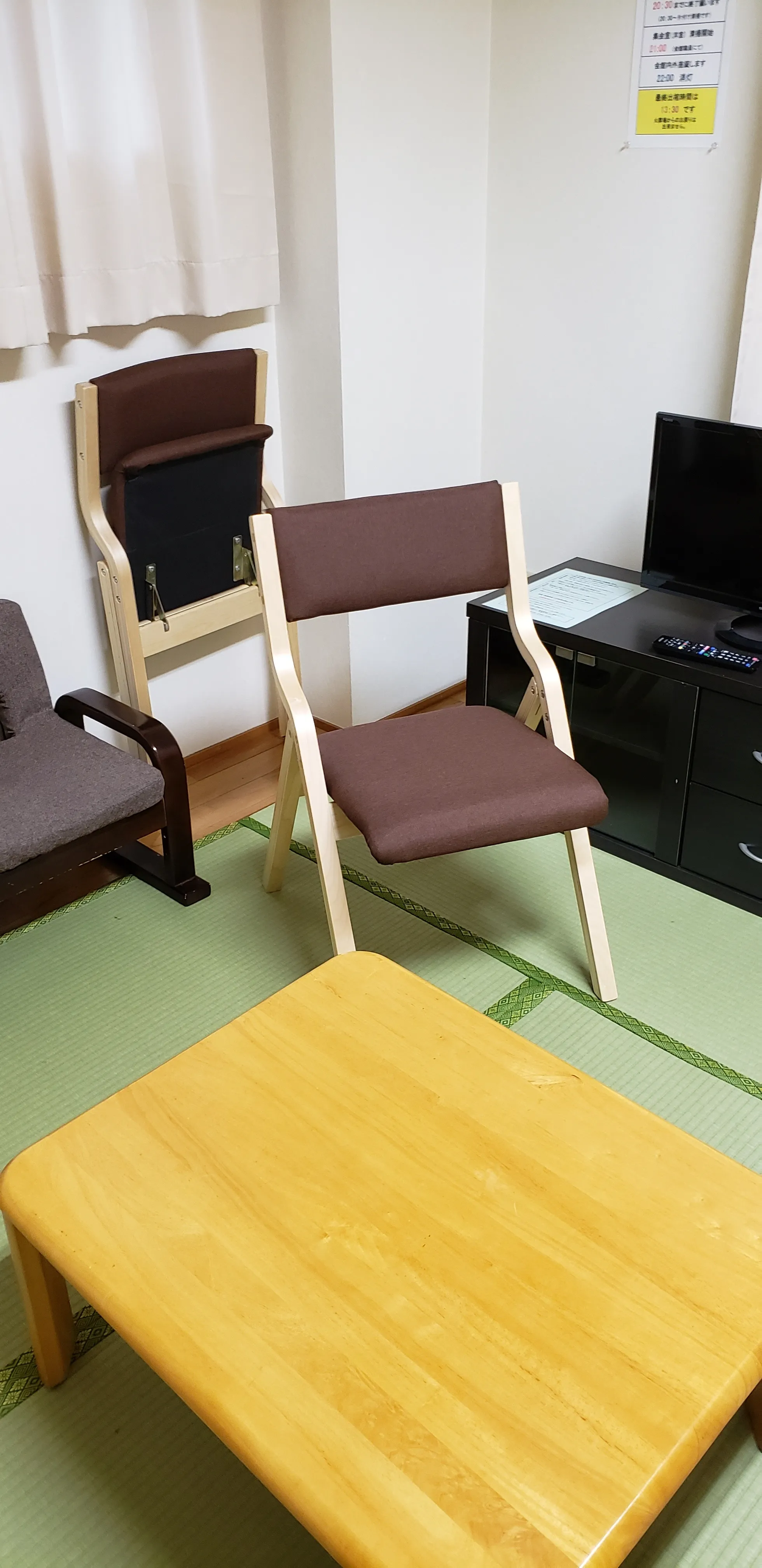 平和の森会館には和室の控室があります。和室専用の座高の低い椅子が常設されていましたが、足の不自由な方やご高齢の方には座りずらいため、新しく座高の高い介護用の椅子も設置しました。(1階2脚、2階1脚)