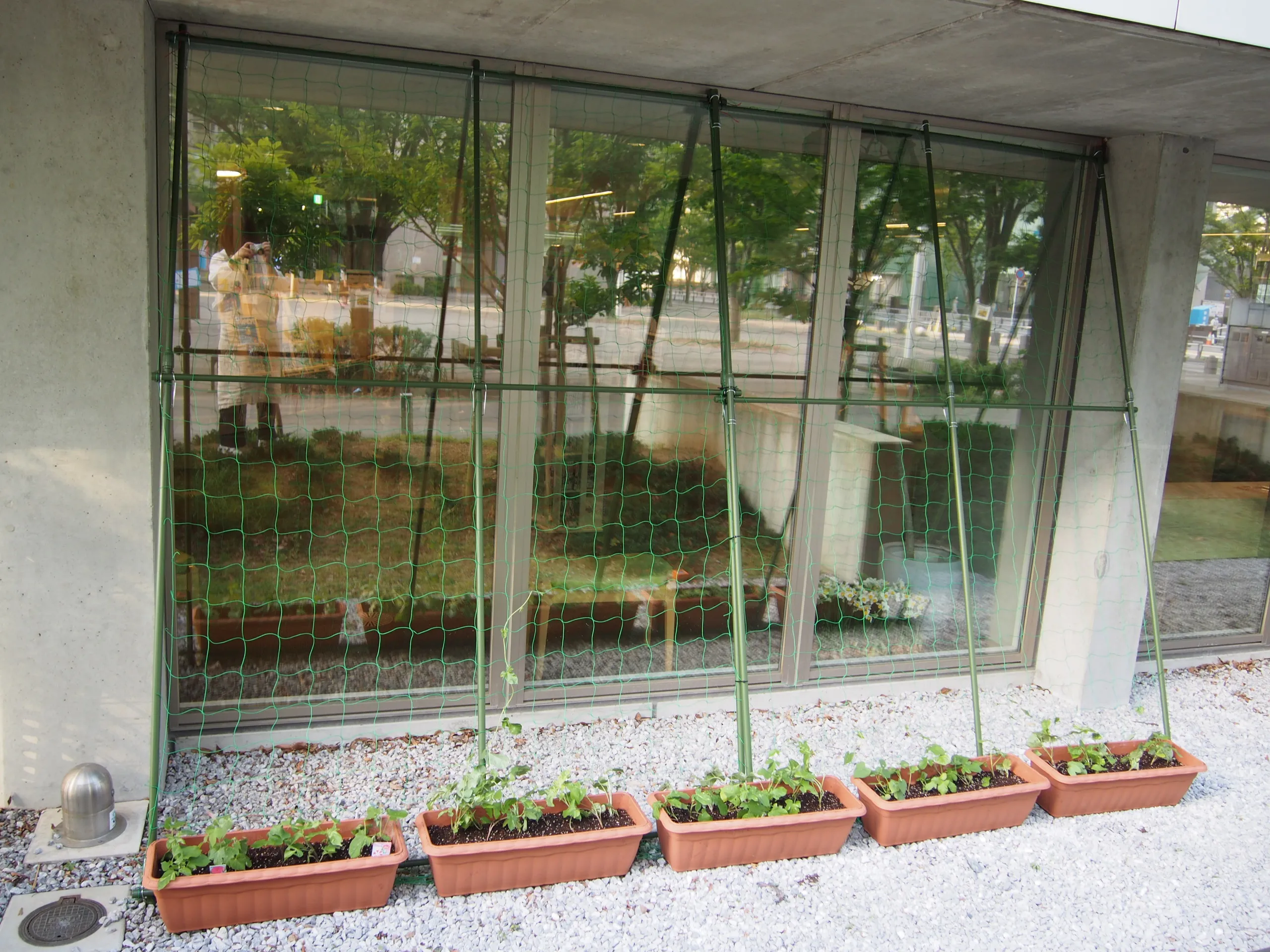 東図書館では、はじめてのグリーンカーテンにチャレンジしました。今回ははじめてということもあり、苗から始めることに。朝顔を30ポット、きちんと育ってくれることを願いながら植え込みました。