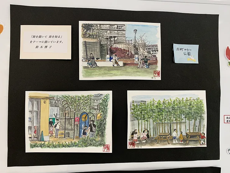 2階ロビーに立ち寄ったら、公園内を描いたスケッチ画が展示されていた。子どもに人気のフォトスポットや遊んでいる人々が描かれていてとても興味深く拝見した。近隣にお住まいの高齢者が描かれたと伺った。とても暖かいまなざしを感じる。
