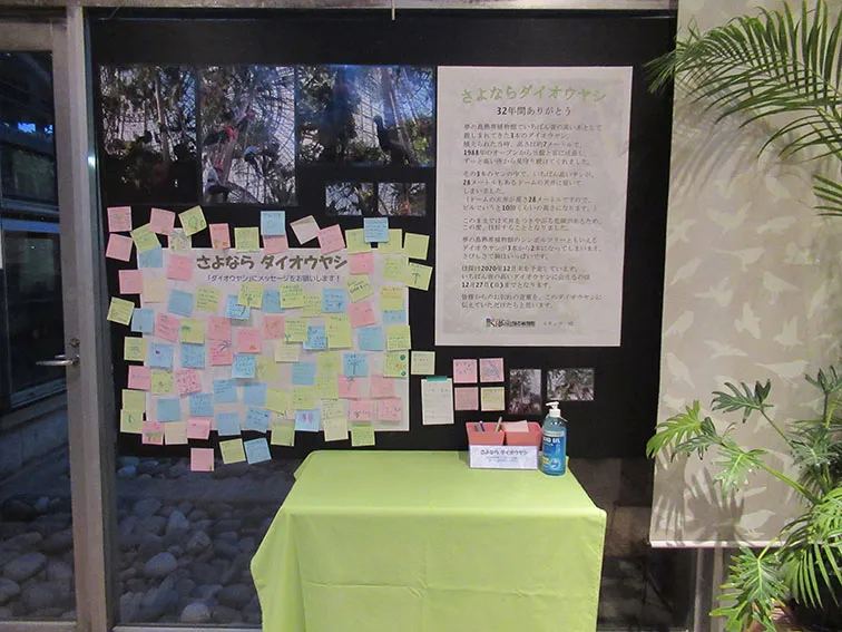 ヤシをはじめとする単子葉類植物は、頂点にある生長点を切り落とすと脇芽が出ることなく枯死してしまいます。従いましてダイオウヤシは止む無く伐採をいたします。これまで32年の長きにわたってご来館のお客様に親しんでいただきましたダイオウヤシですので、皆様に広く公開し、伐採前に懐かしんでいただくコーナーを設けさせていただき、多くのお客様からメッセージをいただきました。また伐採しました28メートルのダイオウヤシはしばらく前庭に展示いたします。
