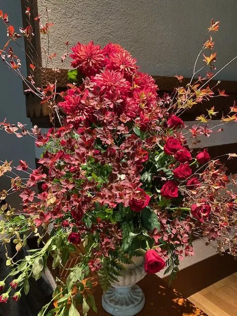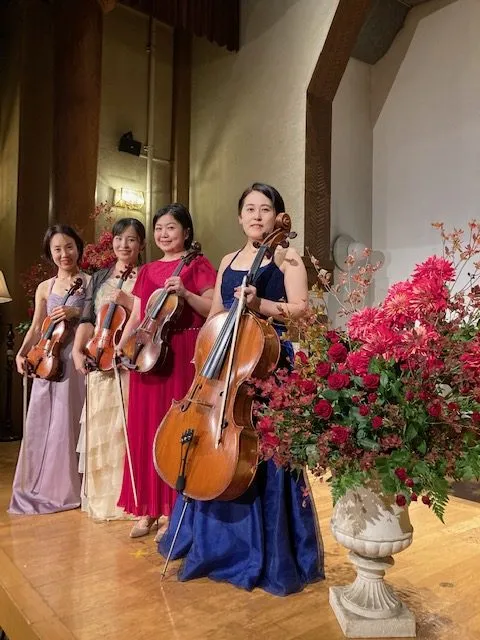 横浜市指定有形文化財である大倉山記念館で、日比谷花壇だからこそできる事業として、2018年より開催している花音コンサート。今回は深紅の薔薇と大きなダリアを中心とした装花で、満員のお客様をお迎えしました。マルシェ弦楽四重奏団の皆さまの素敵な演奏と豪華なお花で、素晴らしい時間をお楽しみいただきました。