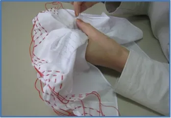 参加人数7名でした。技法は平縫い、山縫い、巻き絞り、日の出絞り等。1日目は縫い終わりまで。 2日目はすべての糸を絞ってもらい、引き締め具合を確認してから染め始める。染め作業もスムーズに進行し、天気もよかったこともあり、乾かして糸を外し皆で出来上がりを見て講評ができました。