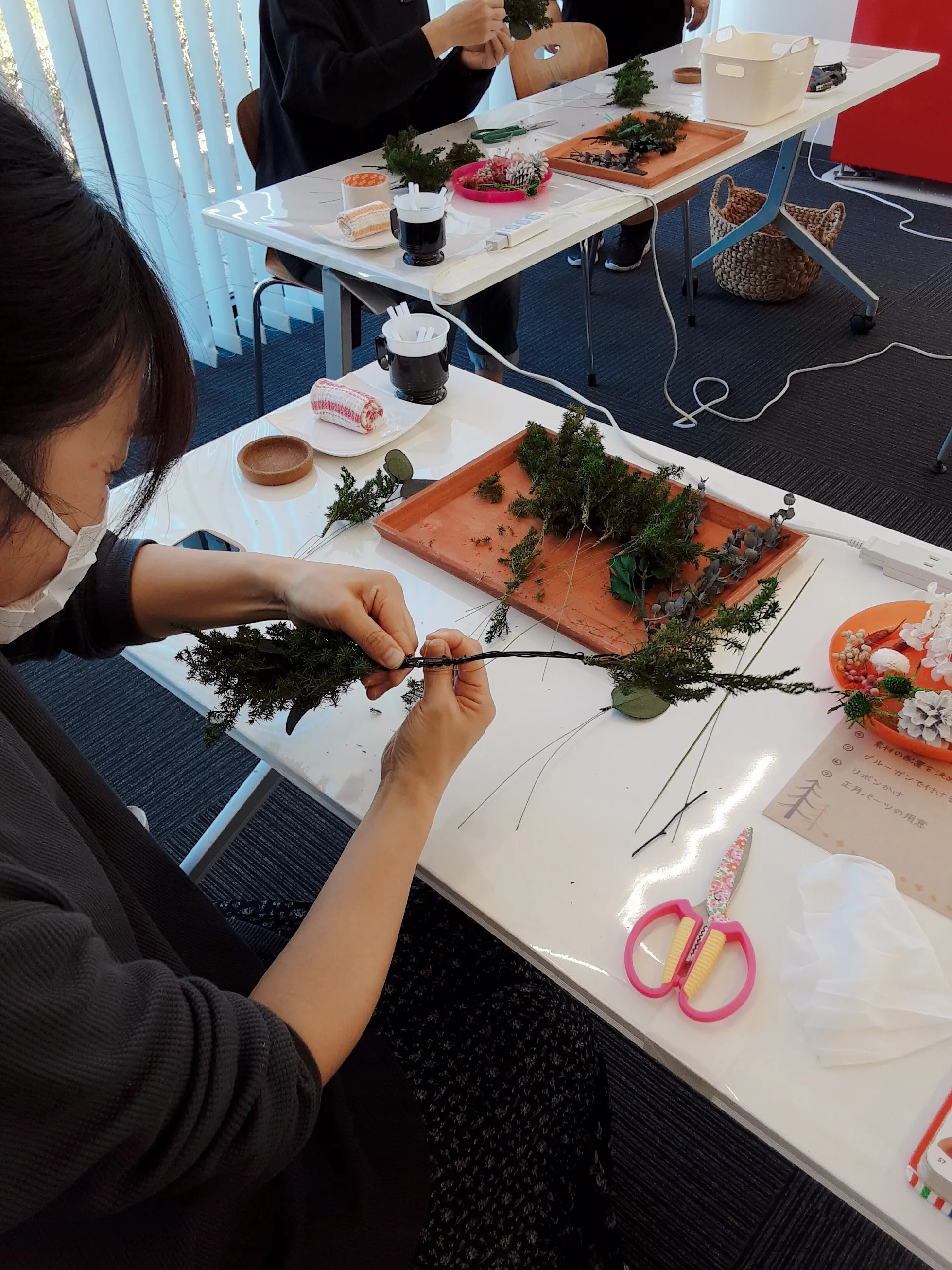 何もかも初めてでワイヤーやグルーガンの使い方などとまどうこともありましたが、素敵な材料で丁寧に教えて頂けてわかりやすかったです。2歳の娘がずっと座ったままでいることが出来ず、スタッフさんに遊んでいただきスワッグ作りに集中して楽しむことができました。